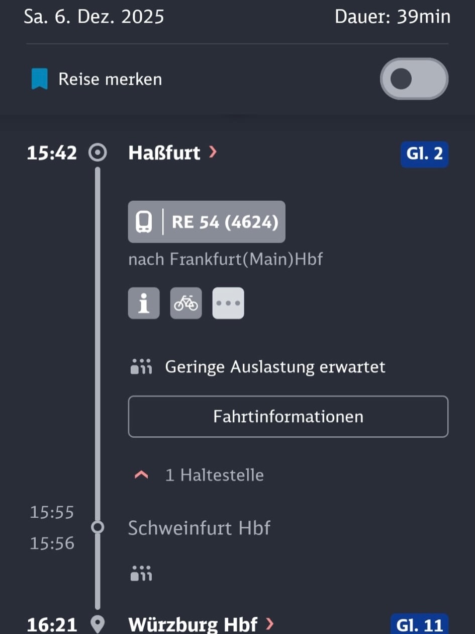 Wir kommen dann voraussichtlich um 16:21 Uhr in Würzburg am Hauptbahnhof an.